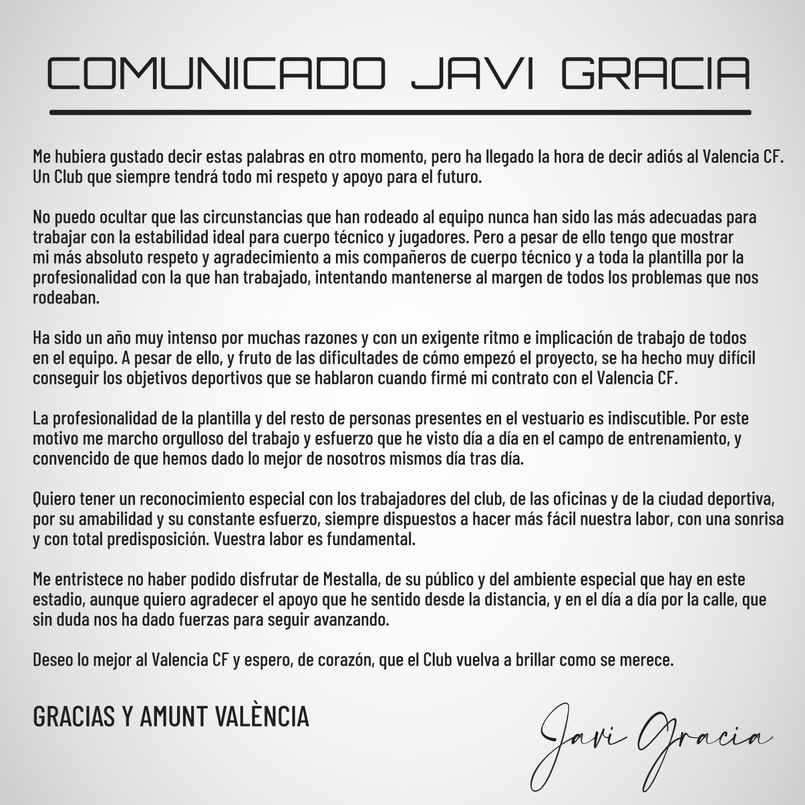 Мне грустно, что я не смог насладиться Местальей, его публикой и особой атмосферой, существующей на этом стадионе, хотя я хочу поблагодарить за поддержку, которую я ощущал на расстоянии и изо дня в день на улице, что, несомненно, дало нам силы двигаться вперед. Я желаю Валенсии всего наилучшего и искренне надеюсь, что клуб снова засияет так, как он того заслуживает. СПАСИБО И АМУНТ ВАЛЕНСИЯ!