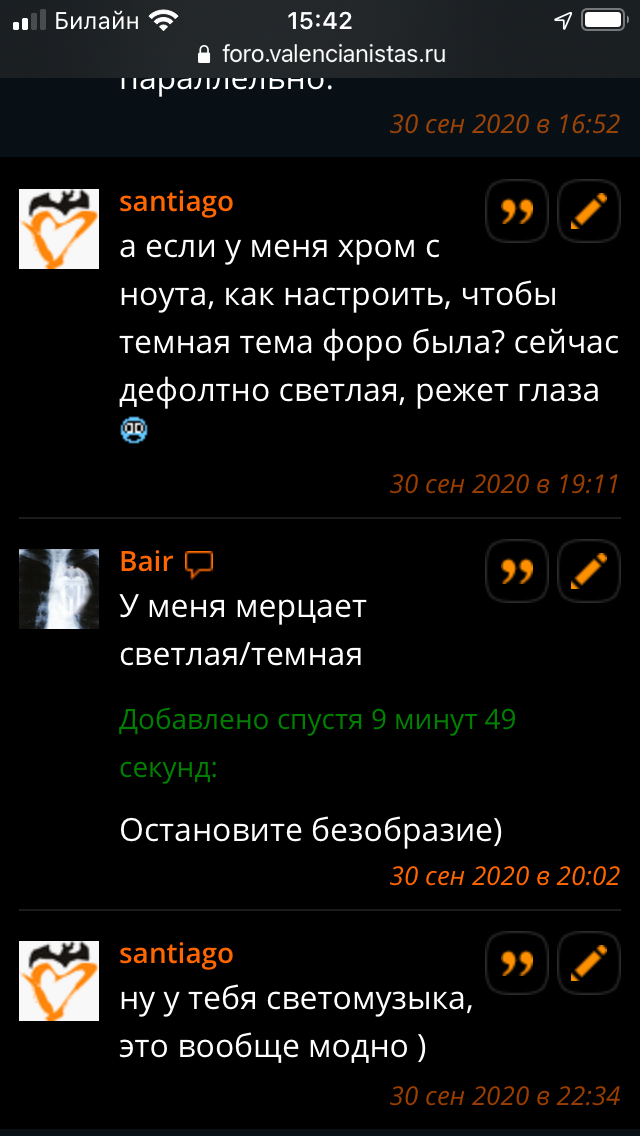 — santiagoа если у меня хром с ноута, как настроить, чтобы темная тема форо была? сейчас дефолтно светлая, режет глаза :nervous: